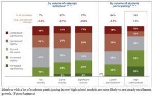A survey of 250 high school administrators showed that more than half of districts and charters with high participation in redesigned programs saw enrollment growth between 2022 and 2025. Those with minimal participation continued to see enrollment decline.