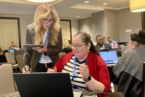 Miami fourth-grade teacher Mariely Sanchez, right, confers with Laylah Bulman during a recent AI training sponsored by the American Federation of Teachers in Washington, D.C. The union said it would open an AI training center for educators in New York City this fall with $23 million in funding from OpenAI, Anthropic and Microsoft.