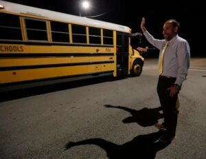 Sam Fisher, chairman of the Lee County School Board, waves to school bus drivers as they depart the west zone bus compound in Cape Coral for their routes Monday morning, August 12, 2024.