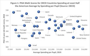 To the extent that public education systems broadly equip students with the knowledge, skill and habits required for success, they are more inclusive. If, however, an institution provides such outcomes only to a subset of elite students, they become more exclusive. The extent that electoral participation in public education systems is broad, it is inclusive, to the extent that it is narrow, it becomes less inclusive. International examinations of student achievement have disappointing results for American students. Among countries that spend at least half as much per pupil as the United States (29 countries), America scored below all but one (see Figure 1) below.