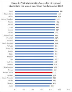 We can judge the relative inclusivity of the American education system by seeing how our low-income children compare to low-income children in countries spending at least half of what the United States spends per pupil. Scores by family income data are available in the 2022 PISA exam, displayed in Figure 2 below.